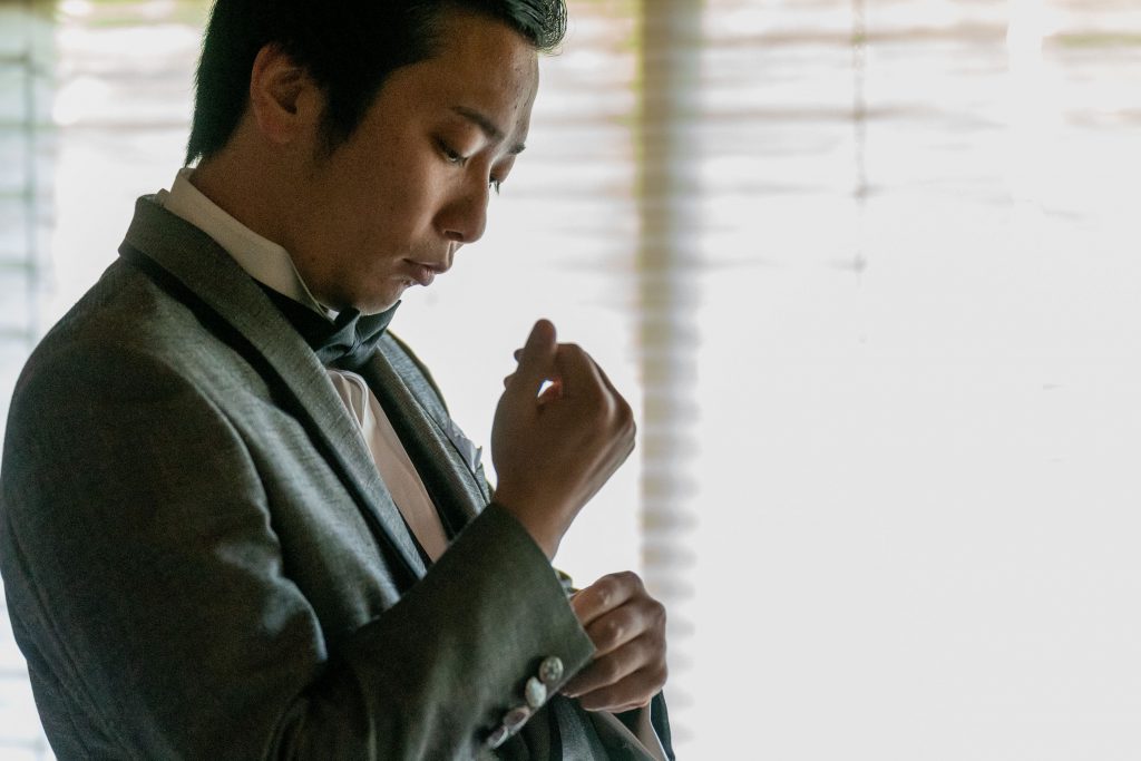 新郎様の胸元には、新婦様手作りのブートニア。