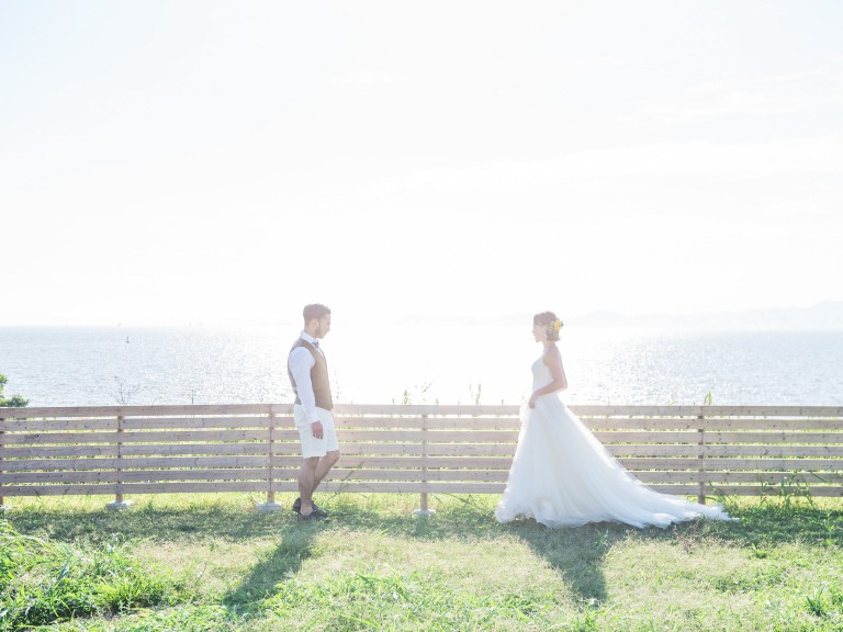 美しい海を望み、ゲストの前で一生の愛を誓う。 青い海と青い空、素晴らしい景観がおふたりの始まりの舞台に。 -